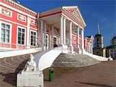 Kuskovo This estate museum is located within the city limits, 12 kilometers (eight miles) to the southeast. The lands of Kuskovo were in the Sheremetyev family since the early 17th century. (Boris Sheremetyev fought with Peter the Great against the Swedes in the Battle of Poltava in 1709). The Sheremetyevs were incredibly wealthy with over three million acres of land holding and 200,000 serfs. When Boris` son Pyotr Borisovich married a Romanov princess in 1743, they decided to built a summer estate at Kuskovo, where as many as 30,000 guests could be entertained in a single day; it was soon nicknamed the Moscow Versailles. The pink and white wooden mansion (1769 75) was designed by Karl Blank and the serf architects Alexei Mironov and Fyodor Argunov. It is faced with white stone and decorated with parquet floors, antique furniture, embroidered tapestries and crystal chandeliers; notice the carved initials PS over the front floor. The mansion also houses an excellent collection of 18th century Russian art; a portrait of Catherine the Great hangs in the Raspberry Drawing Room and the White Ball Hall is decorated with rich bucolic scenes pained by Sheremetyev serf.